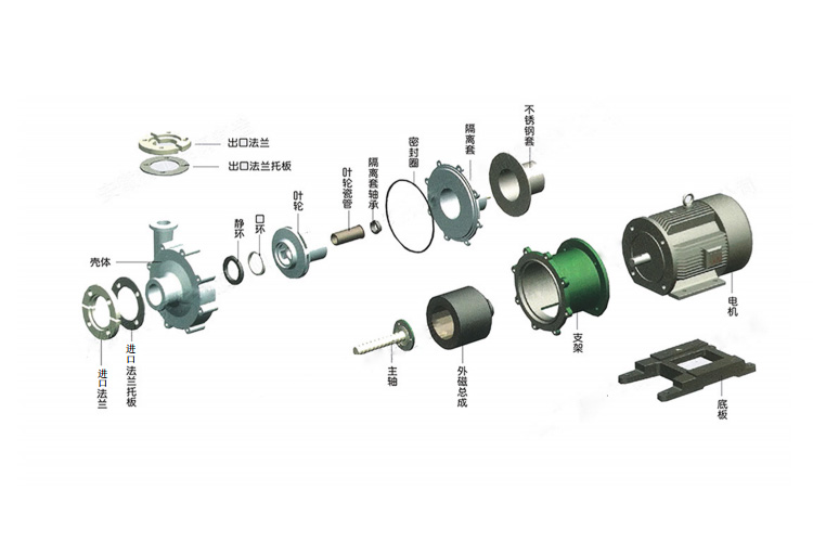 Магнитный насос из фторопласта серии CQB, использующий привод магнитной муфты, без точки динамического уплотнения, решает проблему с уплотнением центробежного насоса общего привода вала снаружи, проблемой капель. В компонентах потока используется фторопласт и промышленная керамика высокой чистоты, он обладает превосходной коррозионной стойкостью и герметизирующими свойствами, широко используется в химической, фармацевтической, алюминиевой фольге, кислоте, красках и других отраслях цветной металлургии, а также при транспортировке взрывоопасных, летучих, токсичных веществ, органические растворители и драгоценные жидкости.